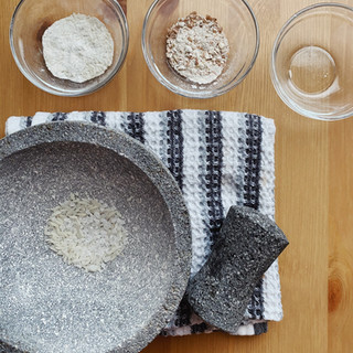 Throw in about 1 spoonful of rice and grind it until you get a coarse powder. You want to make sure you grind the rice around the entire bowl, not just the center. Looking at the ground rice, you will notice specks of rock which is good - the grinding process helps seal up small holes and smooth out the bowl's surface. Throw away the grinds.